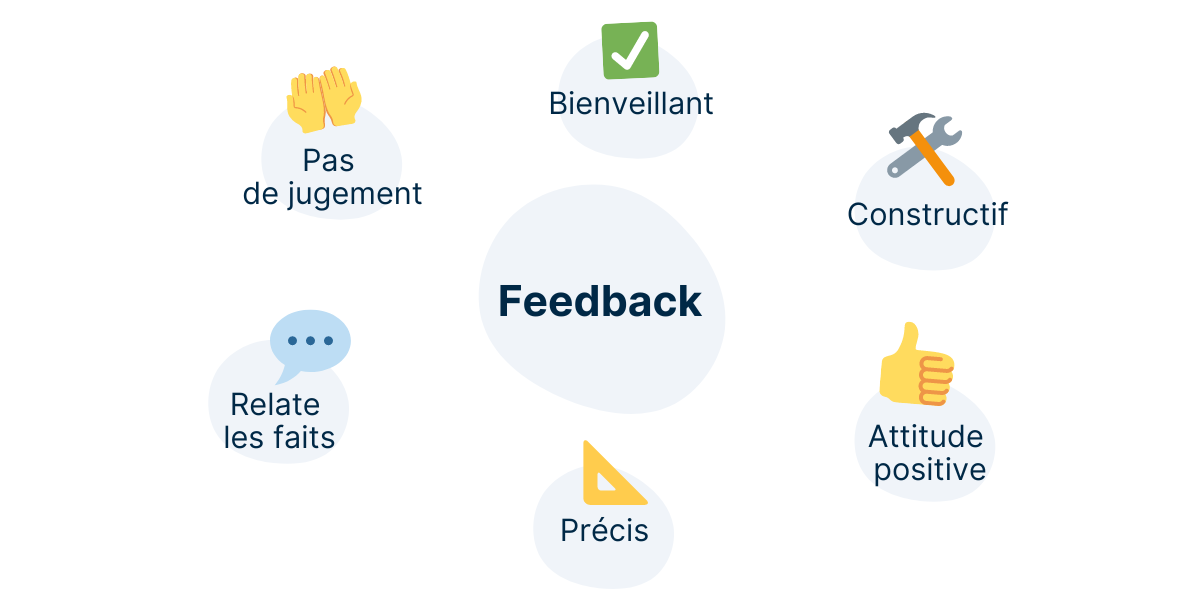 Pour être efficace, un bon feedback est clair, factuel et se concentre sur des faits concrets et inclut des suggestions d'amélioration.