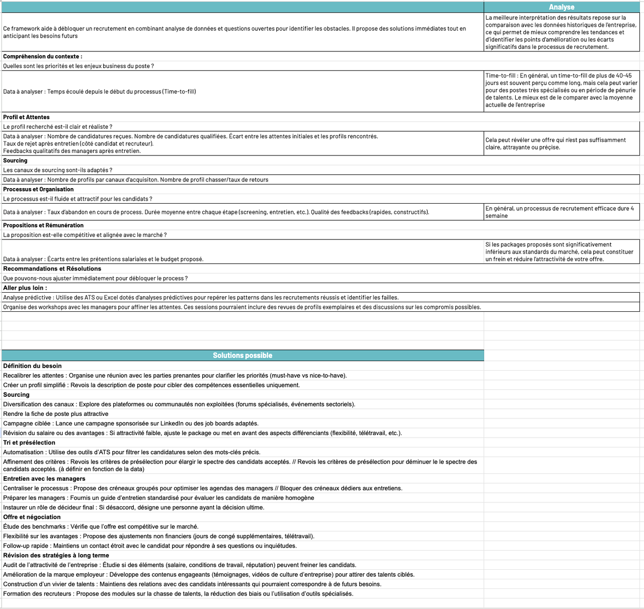 Bonus : Justine a formalisé ses questionnements pour débloquer ses recrutements sous forme de tableau. Avec toute simplicité, cela permet de mettre le doigt sur les obstacles et les solutions potentielles.
